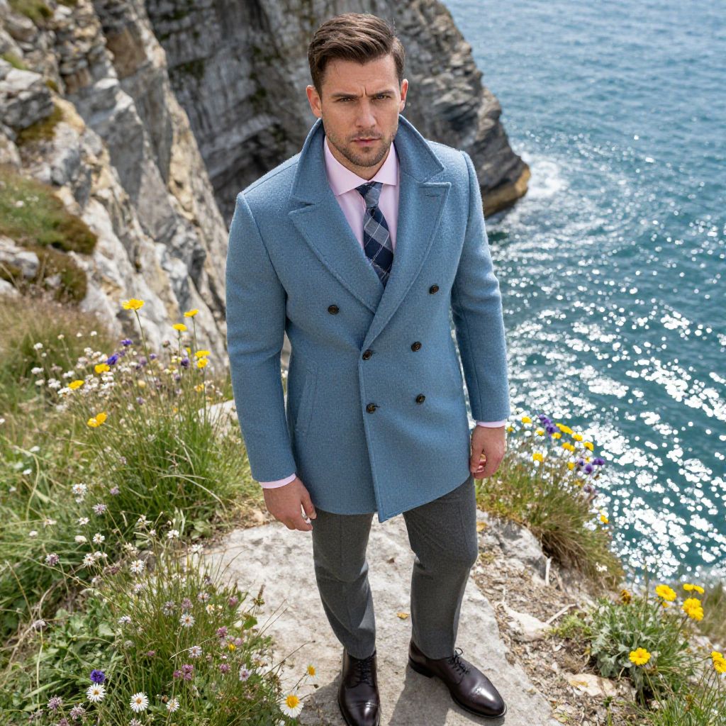 A man, slate blue double-breasted coat, fitted gray dress trousers, pale pink dress shirt, dark brown leather oxfords, subtle plaid tie in navy and gray, steep cliffs, vibrant wildflowers, sparkling water, overhead shot, confident expression. Man has masculine face and piercing eyes