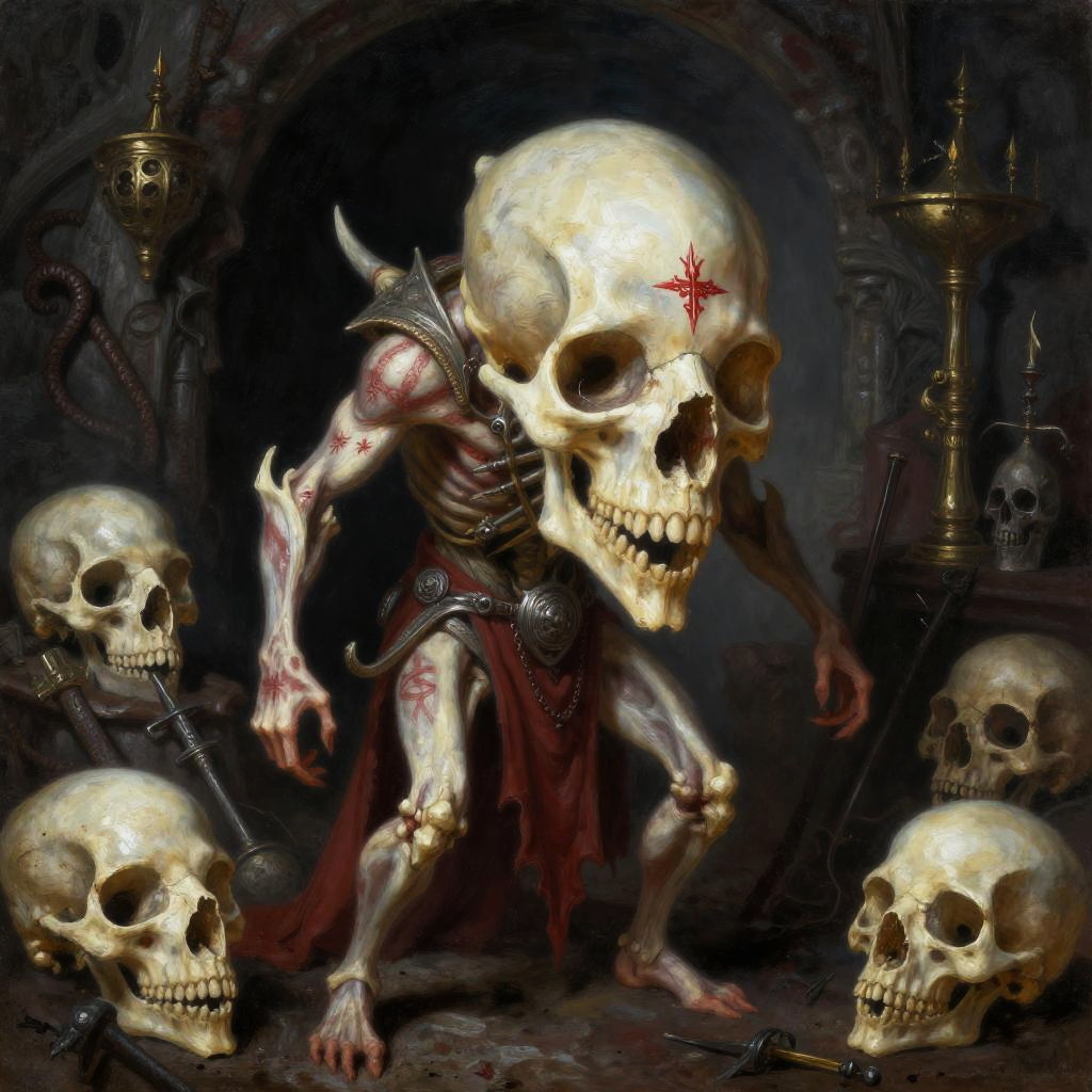 Warhammer fantasy RPG style eldritch bone collector, highly detailed oil painting with pale ivory and dull crimson tones. Set in a haunted crypt with accumulated bone trinkets and faded war paint, evoking a dark and ominous atmosphere.