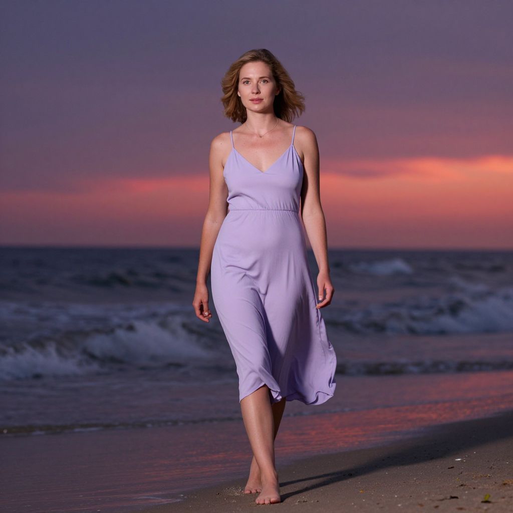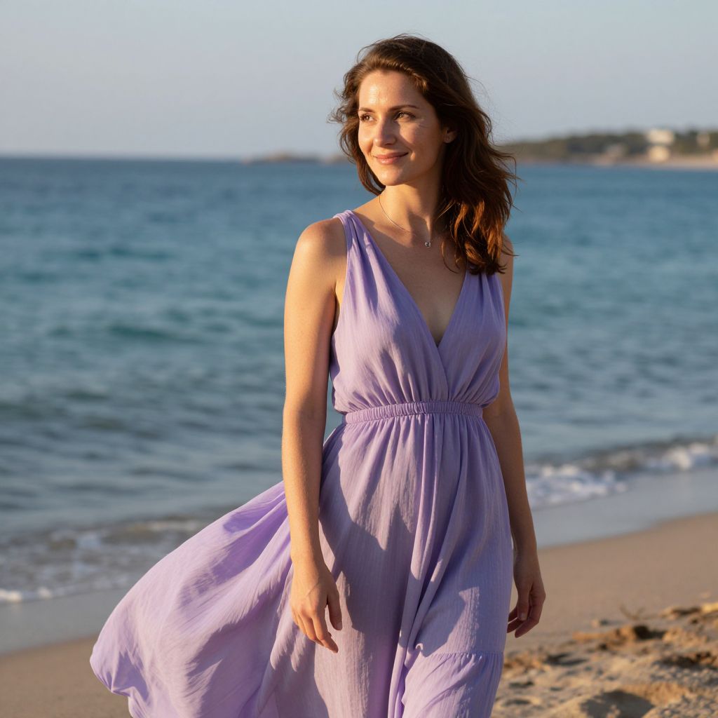 A naturalistic portrait of a woman in a flowing lavender-colored dress standing near a clear turquoise shoreline, her face relaxed with a faint smile, holding a vintage leather-bound book open in her hands as seagulls fly overhead and waves gently lap against the shore in a peaceful coastal setting.