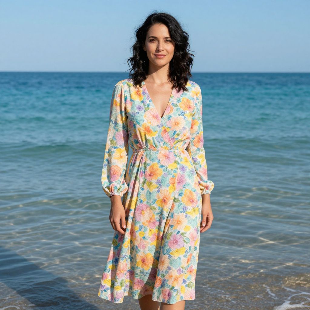 Photograph of a smiling brunette woman with wavy hair, standing on a sunny beach with turquoise water and white foamy waves in the background. She's wearing a sleeveless, light purple dress and holding an open brown book. Two seagulls are flying above her. The woman has a light skin tone and a slender build. The bright sunlight highlights her features and the vivid colors of the beach and sea, creating a serene and peaceful atmosphere.