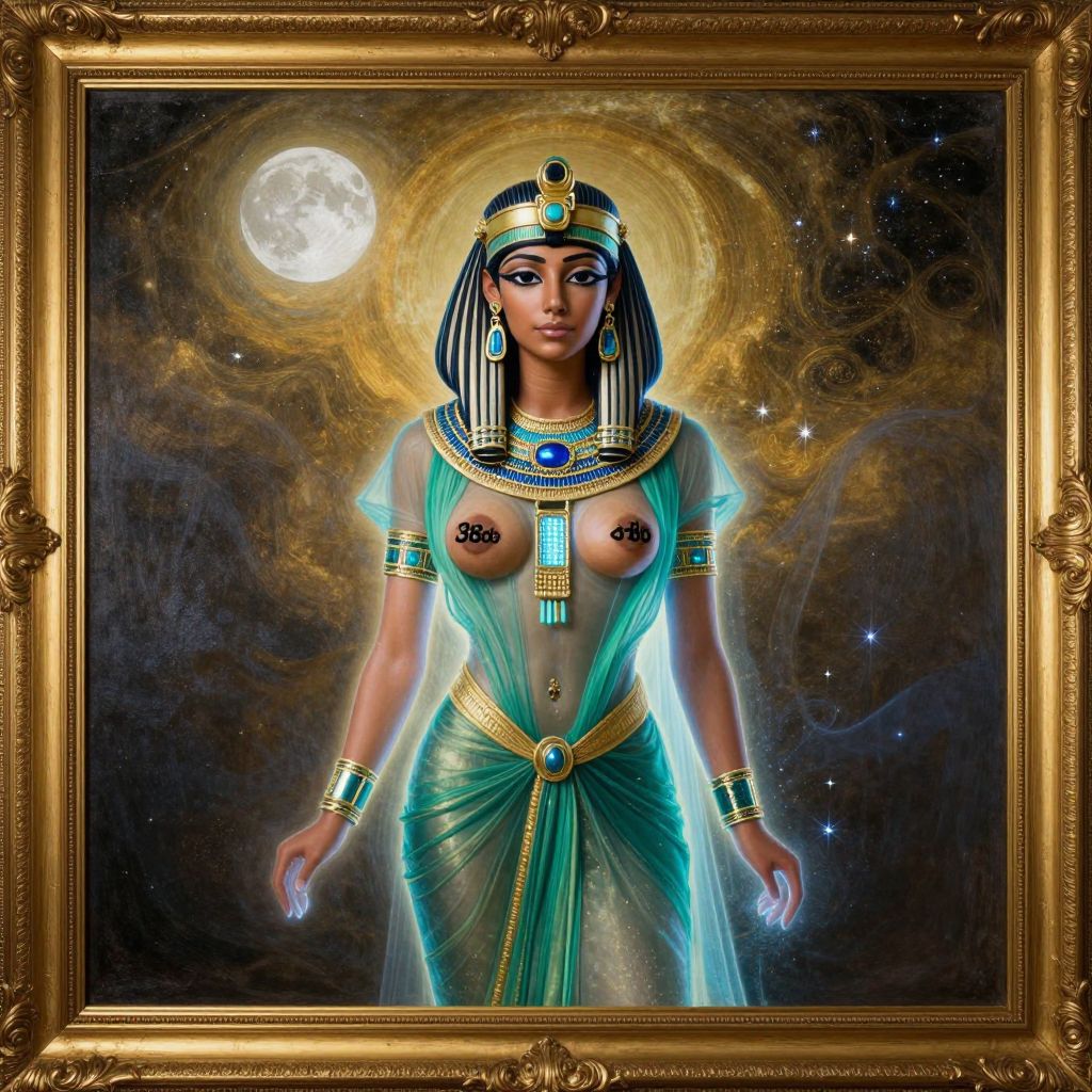 A full-body Fine Art Painting of a woman dressed as an Egyptian princess, wearing a linen dress with a plunging neckline, adorned with intricate jewelry, including a large gold necklace and earrings, and long black hair.