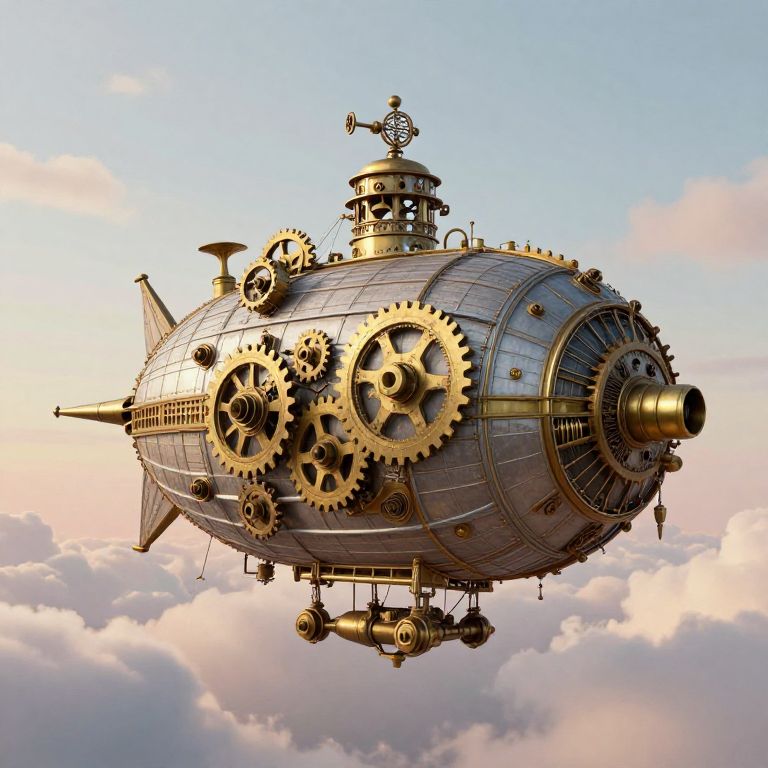 A whimsical steampunk interpretation of gnas flying a vintage airship above clouds, intricate gears and brass instruments visible, soft pastel sky colors, detailed and imaginative concept art with a fantastical vibe