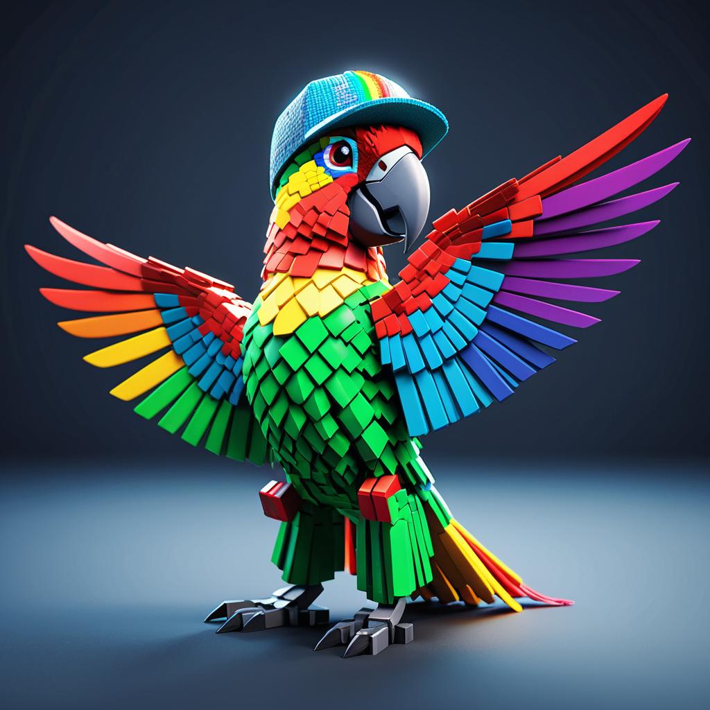 A vibrant pixel art style rainbow parrot with detailed sharp wing feathers. The parrot is wearing a small blue Minecraft-style cap with a rainbow stripe, rendered in bright rainbow colors under vibrant lighting. The digital artwork is highly detailed and rendered using Unreal Engine 5 and Octane with 8K resolution.