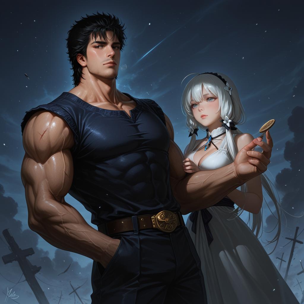 Digital anime-style illustration featuring a muscular man with black hair, prominent scars on his arm, and wearing a sleeveless black shirt and pants with a decorated belt. Standing beside him is a slender woman with long silver hair, blue eyes, and a white dress with black accents, holding a round object. The background is a dark, moody night sky with scattered crosses and a shooting star.