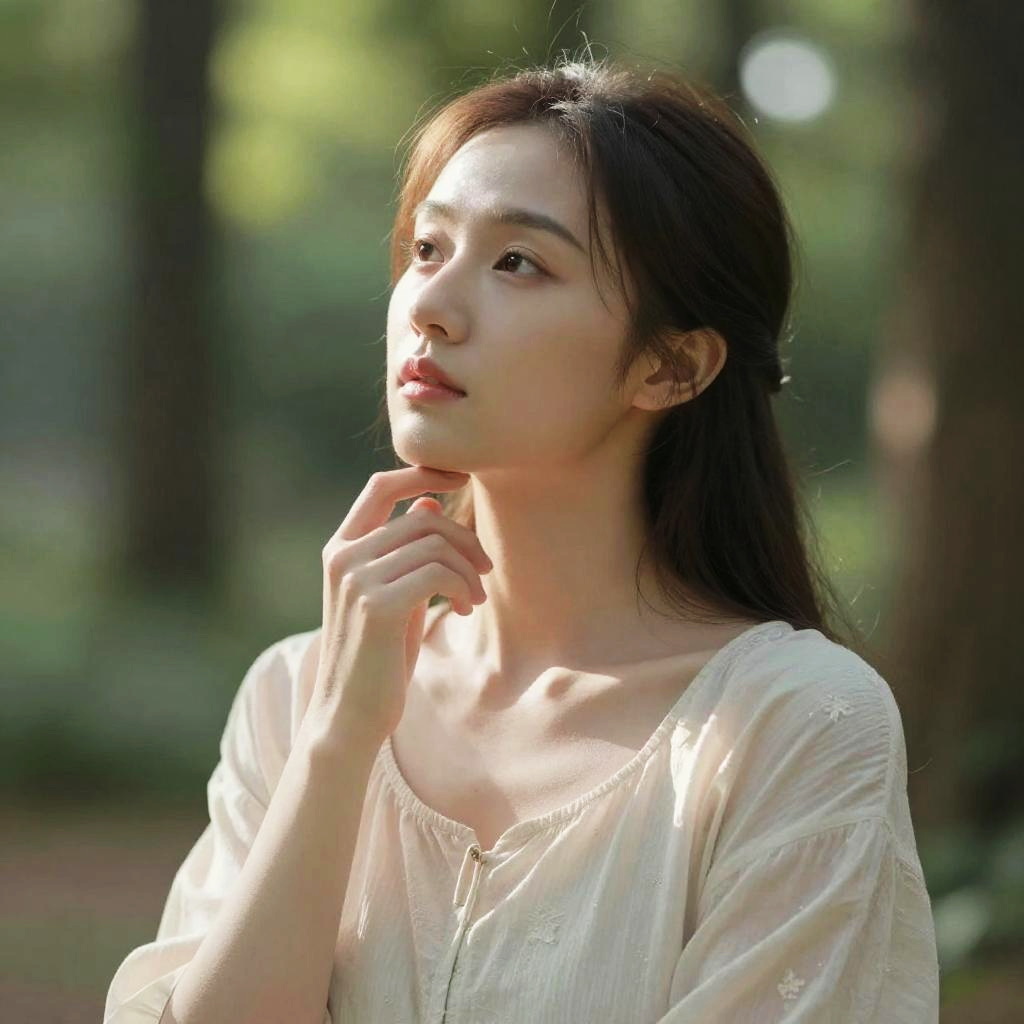 Photograph of an Asian woman with long, dark brown hair, standing in a sunlit forest. She has fair skin and is looking to her left with a soft expression. She wears a light, sleeveless, white top with thin straps. Her hands are clasped together in front of her chest, fingers gently interlaced. The background is blurred, featuring tall trees and dappled sunlight. The image has a serene, natural atmosphere, highlighting her delicate features and the play of light on her face and hair.