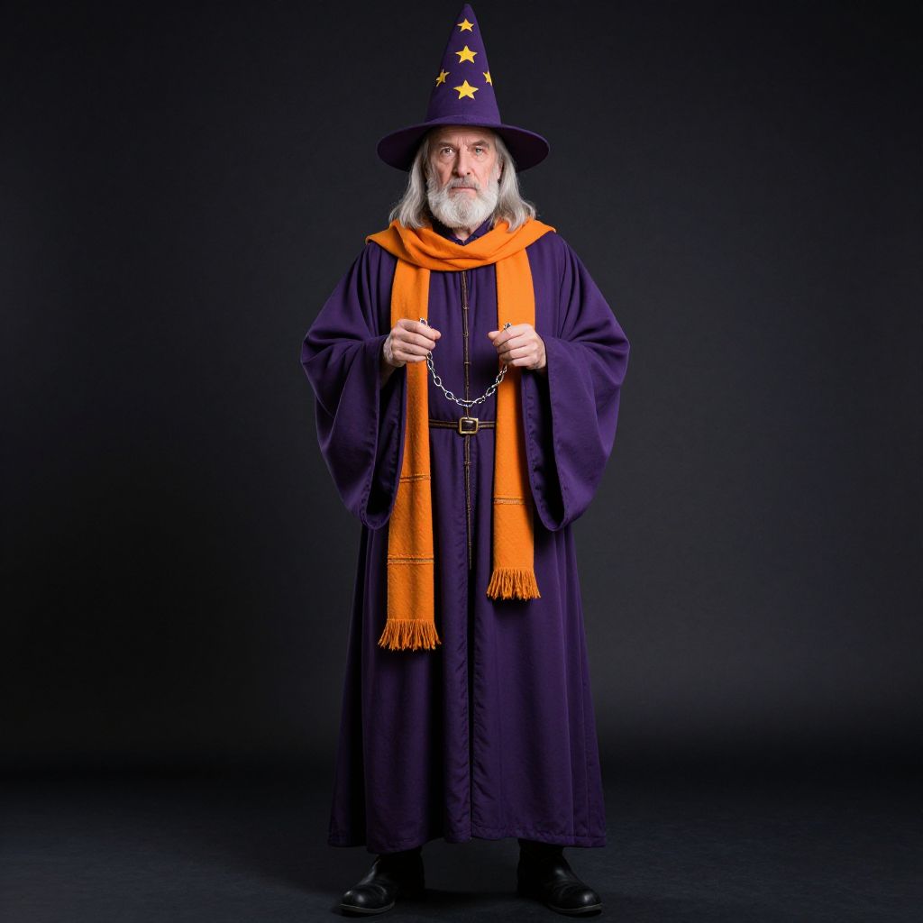 A photograph of an older man with a white beard and mustache, dressed as a wizard. He's wearing a deep purple, long robe with wide sleeves and a matching pointed hat adorned with yellow stars. An orange scarf is draped over his shoulders. He stands against a black background, holding a small chain in both hands, with black boots on his feet. The lighting highlights his serious expression and detailed costume.