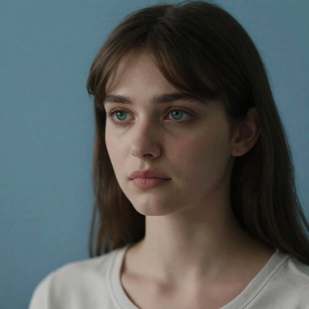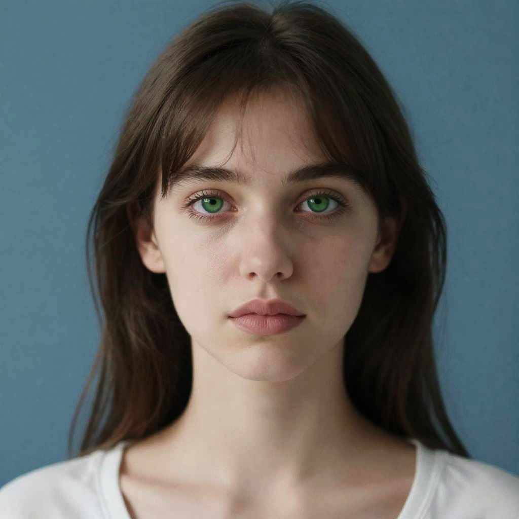 MEDIUM SHOT, high quality, masterpiece, (realistic, photo-realistic:1.2), high definition, ultra detailed, raw photo, depth of field, 1girl, green eyes, medium hair, bangs, portrait, upper body, shoulder, shirt, simple background, blue background