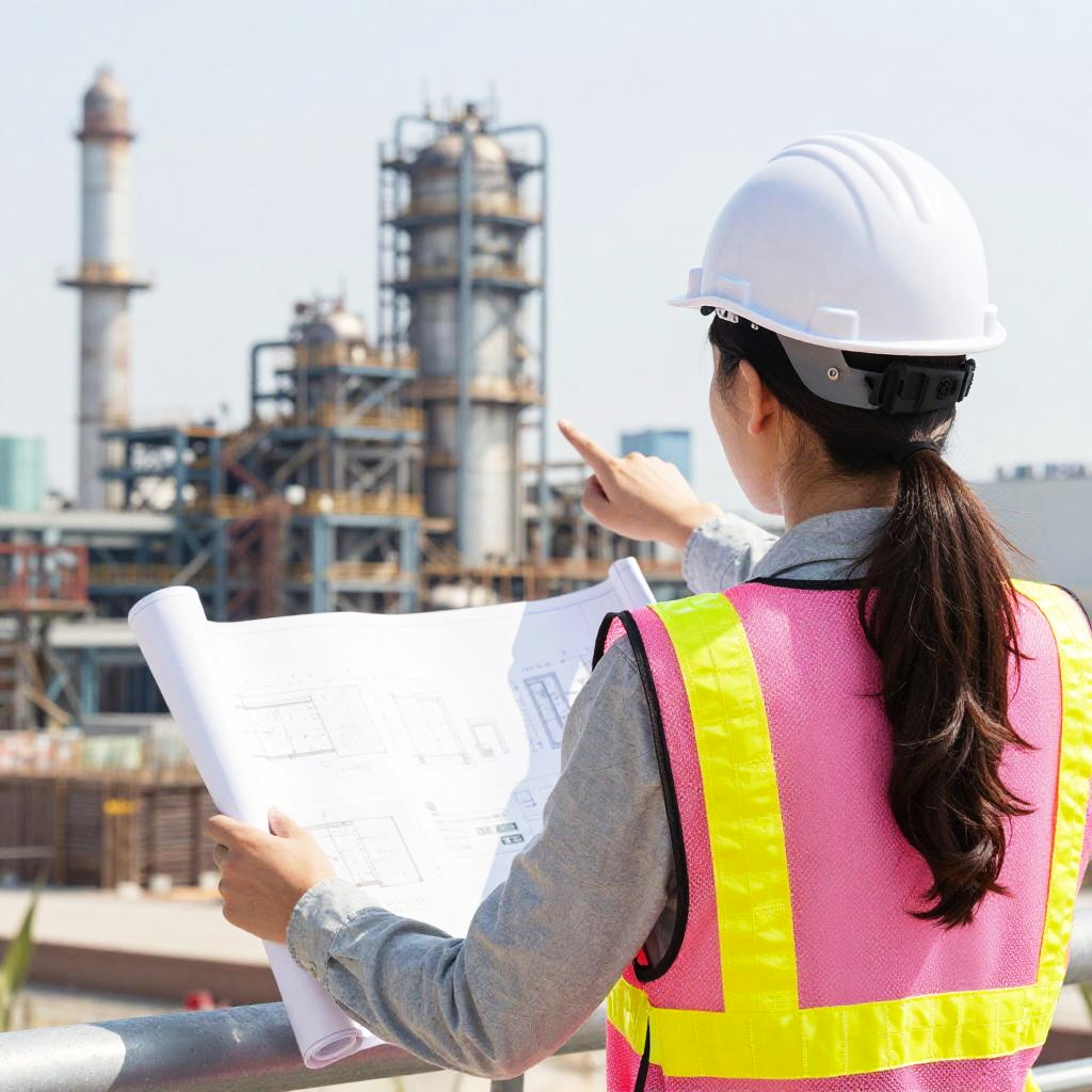 Photograph of a young woman with light brown skin and long brown hair, wearing a bright blue hard hat and a white high-visibility shirt with neon green and orange reflective stripes. She's focused on using a power tool, holding it with both hands, in an industrial setting with blurred metallic beams in the background. Her expression is concentrated and determined.