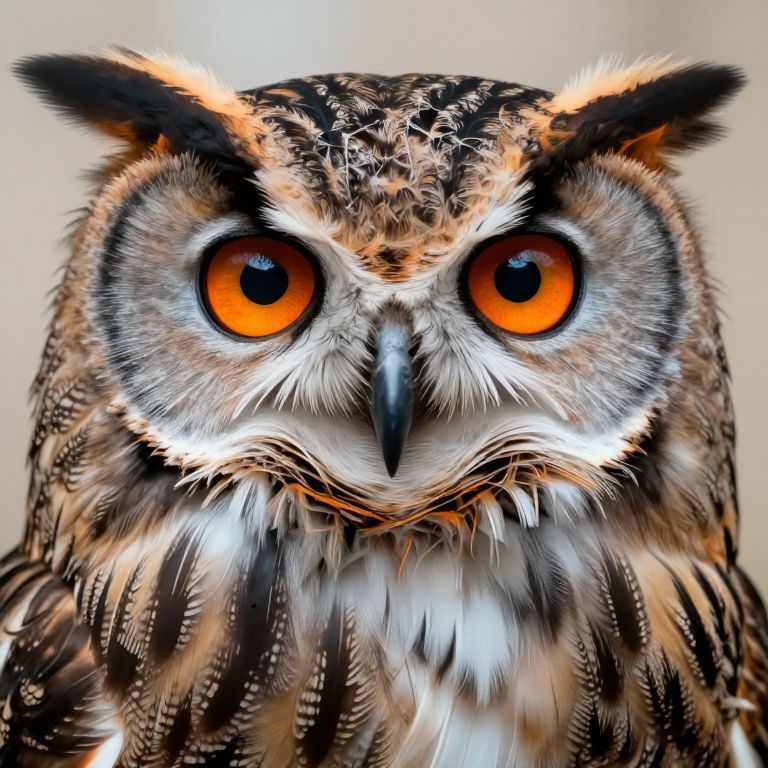 A hyper-realistic digital rendering of an owl, featuring vibrant orange eyes and intricate feather details, exudes a surreal, otherworldly presence as its piercing gaze and mirrored beak evoke a sense of fractured reality transforming into mesmerizing patterns.