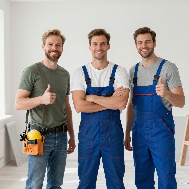 Three Male Workers in Overalls and Tool Belt