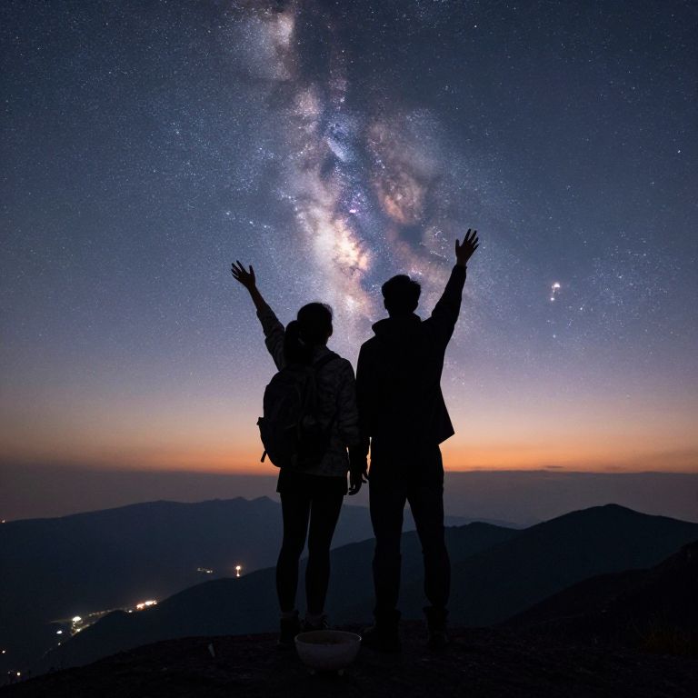 Photograph of two silhouetted figures standing on a mountain peak at night, arms raised in awe. The Milky Way galaxy stretches across the star-filled sky, with a bright core and subtle orange glow near the horizon. The figures, one with a backpack, are dressed in outdoor clothing, standing side by side. The background includes dark mountain silhouettes and a faint, distant light trail. The sky transitions from deep blue to dark at the top, creating a breathtaking celestial view.