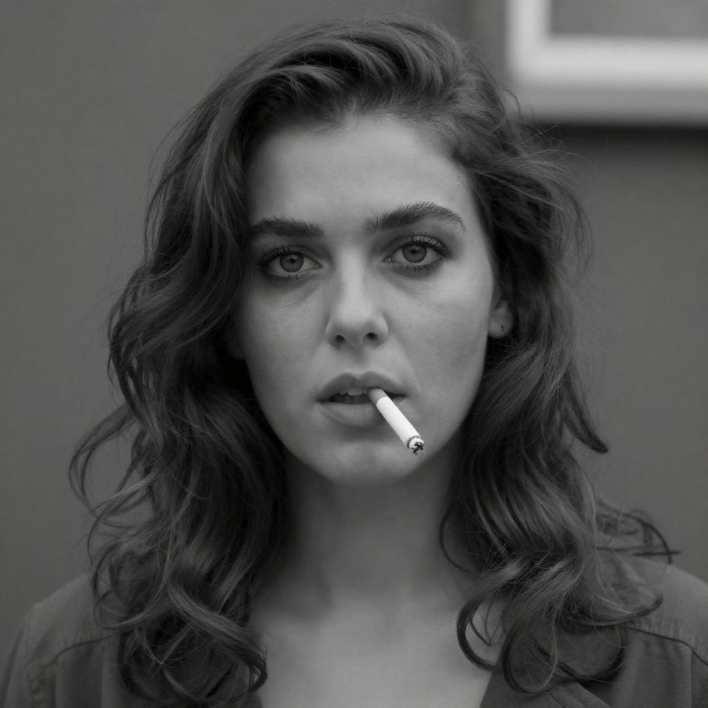 Black-and-white photograph of a woman with wavy, shoulder-length hair and large, expressive eyes. She has a cigarette in her mouth, slightly tilted to the right. Her expression is intense and focused. The background is blurred, emphasizing her face. She wears a simple top, and the lighting highlights her features, creating a dramatic effect.