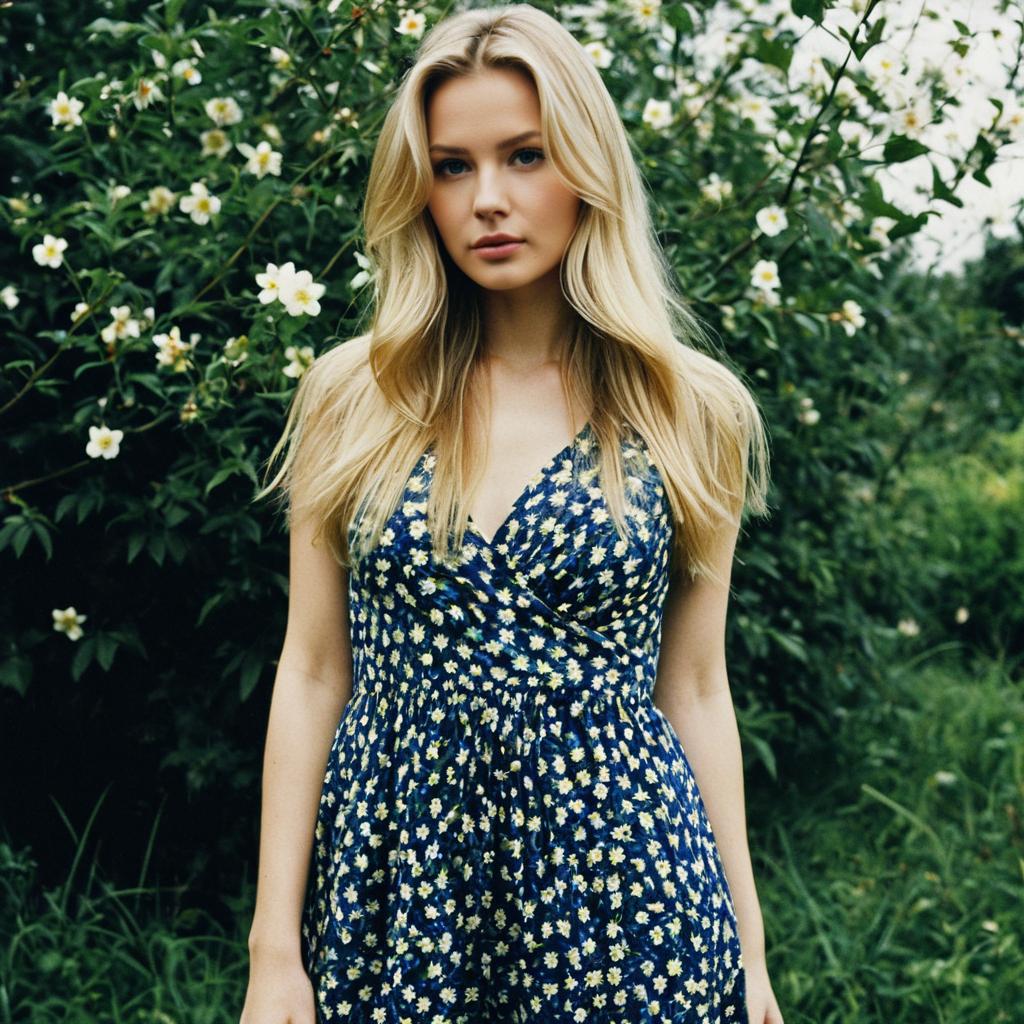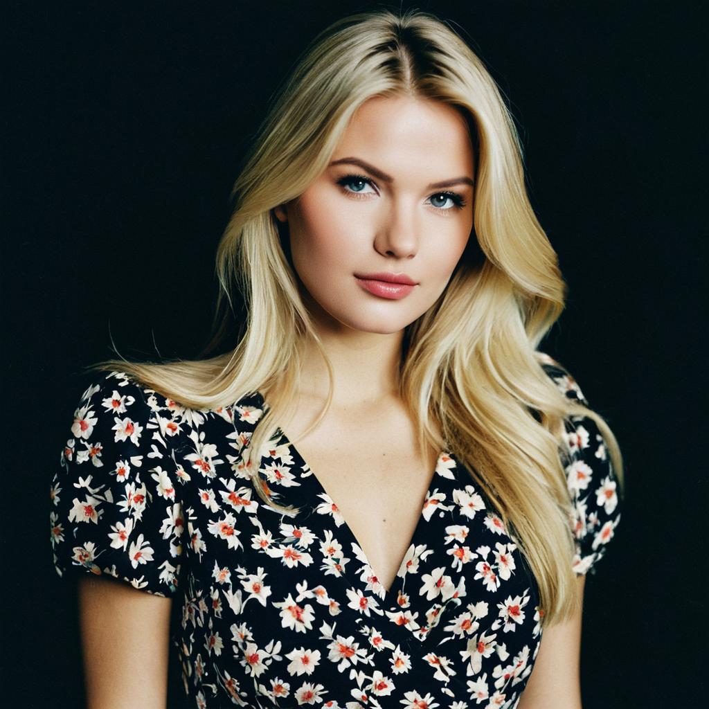 Portrait of a young blonde woman wearing a pink checkered dress with thin straps. She is posed against a solid pink background, looking directly at the camera with a neutral expression. The image highlights her fair skin, light blue eyes, and natural makeup.