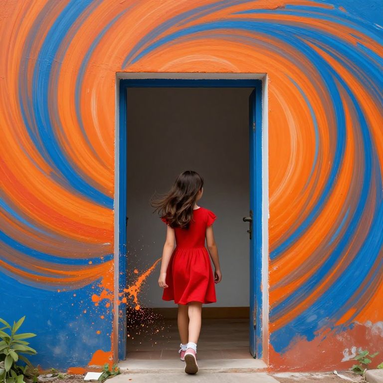 A young girl in a vibrant red dress walks through a doorway framed by a dynamic mural of swirling orange and blue hues, leaving behind a trail of splattered paint that transforms the wall into a vivid expression of her journey.