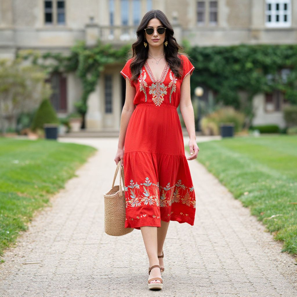 Woman walking confidently down a paved pathway in a vibrant red embroidered midi dress by Free People, accessorized with Castaner wedge espadrilles and a woven straw tote bag, set against a backdrop of manicured greenery and a stately home.