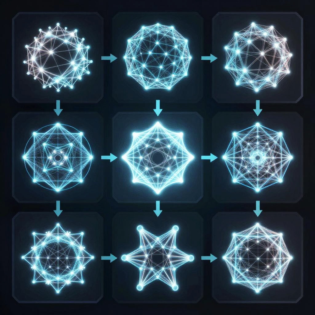 This digital illustration features a 3x3 grid of glowing blue geometric shapes against a dark blue background. Each shape is a wireframe pentagon or hexagon with interconnected nodes, emitting a bright, neon-like light. Blue arrows connect the shapes in a sequence, suggesting a transformation or progression. The top row shows three different initial shapes, the middle row displays the shapes with slight transformations, and the bottom row presents the final forms. The overall style is futuristic and cybernetic, with a focus on symmetry and mathematical precision. The glowing nodes and arrows give a sense of dynamic movement and technological advancement.