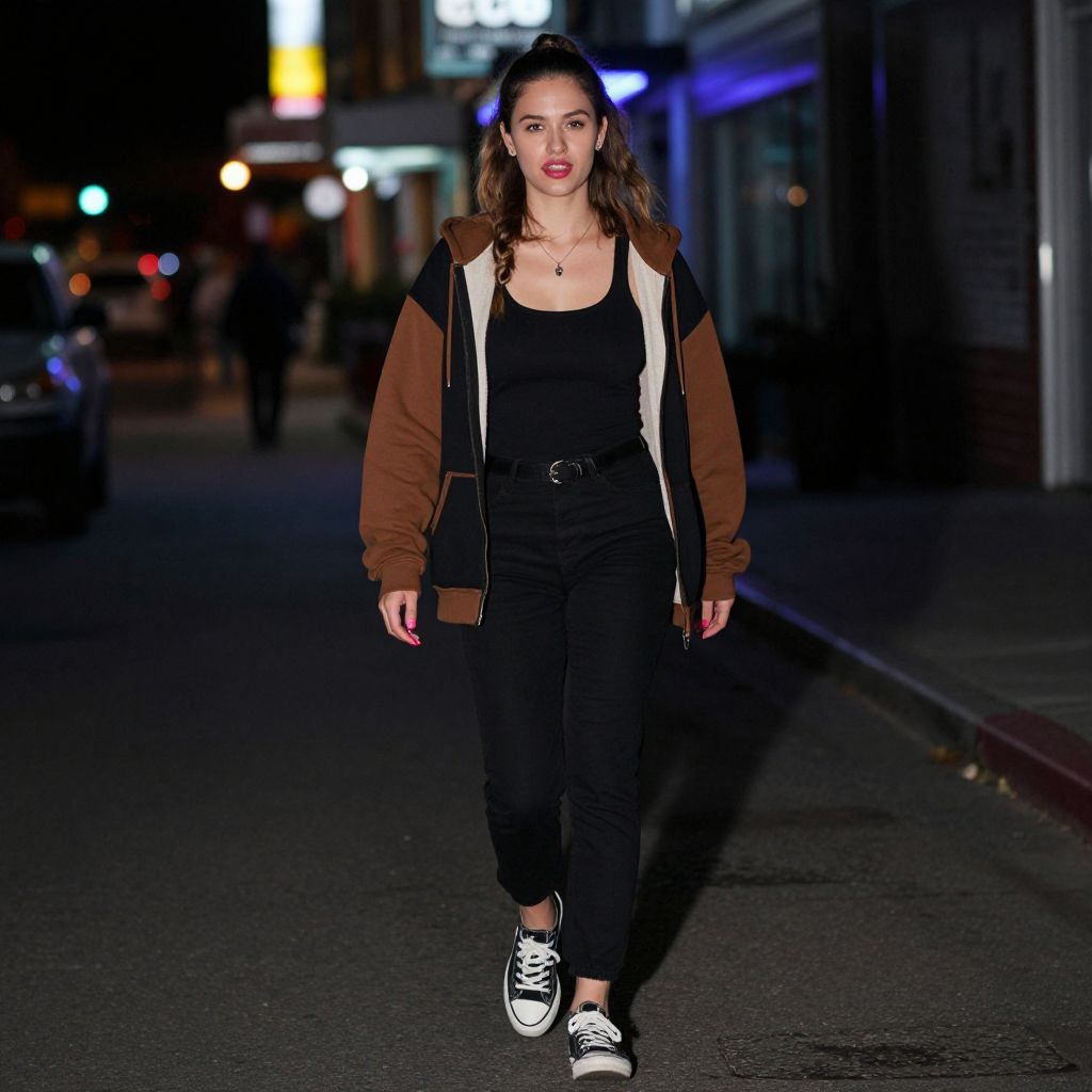 A woman in her late 20s with a confident, stylish demeanor, wearing a brown and black hoodie over a black tank top, paired with black pants and black and white sneakers. Her long, wavy hair is tied back in a loose braid, and she has a playful, flirtatious expression as she walks through a dimly lit urban street at night. The atmosphere is mysterious and slightly edgy, with neon signs flickering in the background.