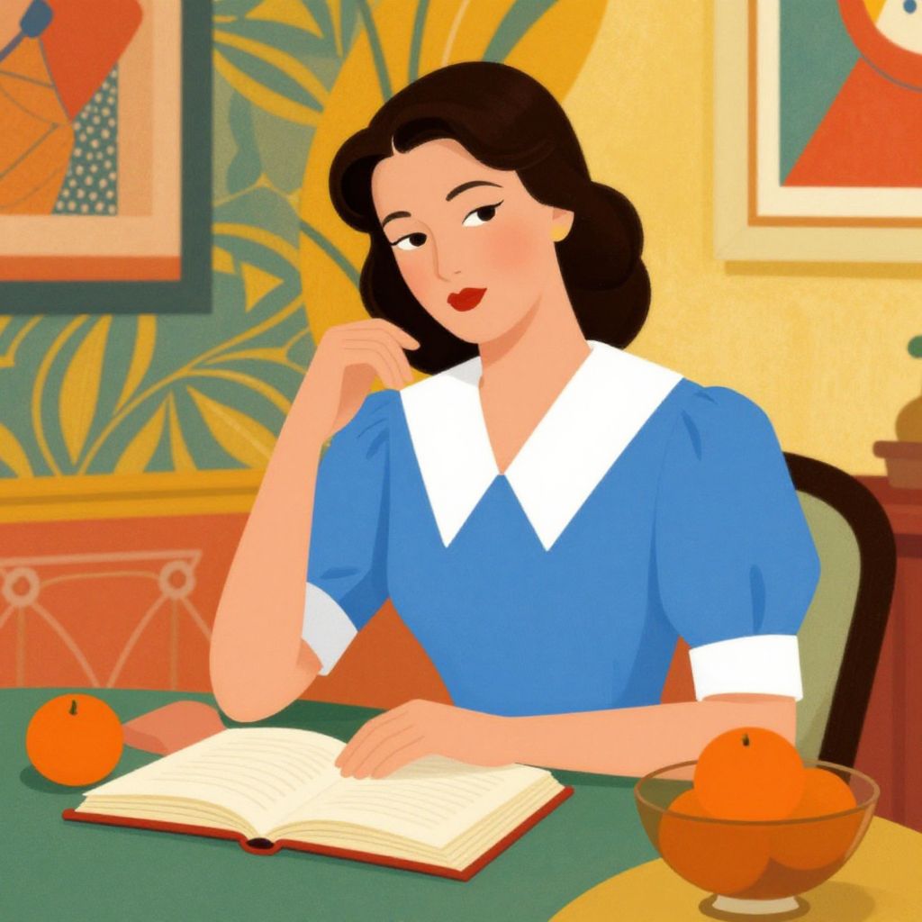 A stylized illustration of a woman dressed in a vintage blue dress with a white collar and cuffs, sitting at a table with an open book and a bowl containing an orange. The background features vibrant, colorful patterns and framed artwork, reflecting a mid-century modern artistic style.