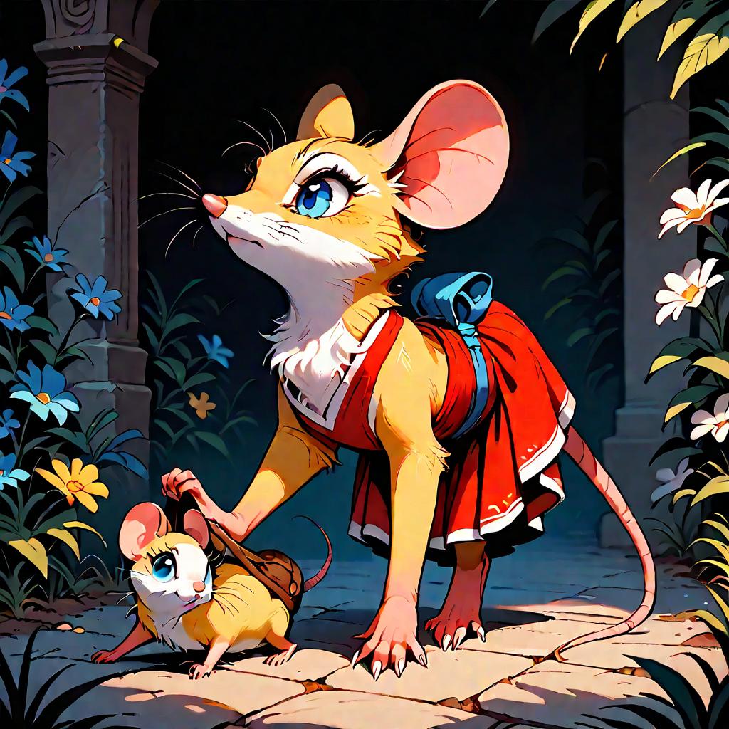 Score_9, score_8_up, score_8, solo, (fluffy:0.5), (feral:1.3), toes, furry, (((mouse))), female, blue eyes, yellow fur, chest, claws, (red dress), in the style of beatrix potter, standing under shelter, outdoors, ((rain)), (solo:2), side view, umbrella
