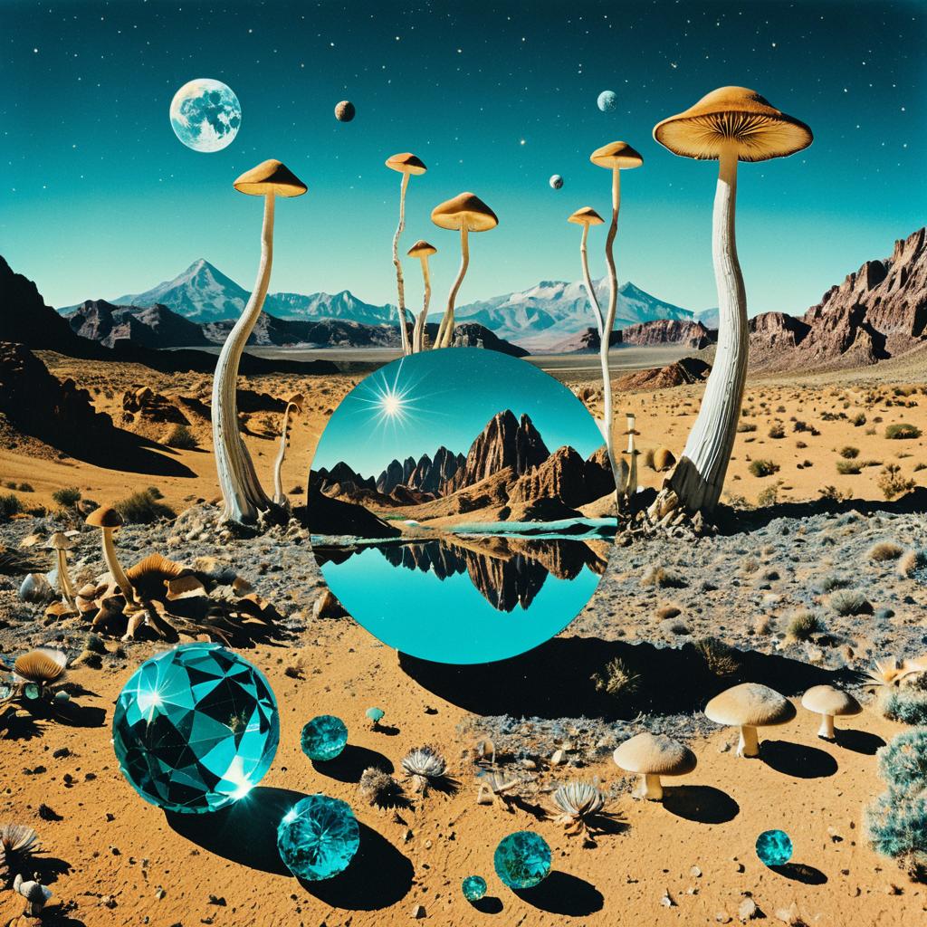Surreal Psychedelic collage of spliced photographs, mushrooms, crystals, alien landscapes, desert landscapes, mountain landscapes, space, planets, orbs, moire patterns, luminescent cyan and gold