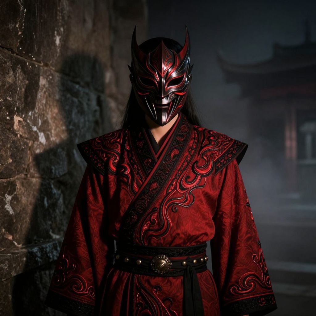 A person wearing a detailed red and black costume with intricate, hand-crafted patterns featuring flowing embroidery and metallic detailing, a dramatic, stylized mask covering their face with sharp, angular design and deep shadowed contours, the mask adorned with glowing red accents that pulse subtly with an otherworldly light, standing in a dark, atmospheric setting filled with fog and dim ambient lighting—soft shadows cast across weathered stone walls and a distant, crumbling architecture—adding depth, mystery, and an eerie sense of suspense to the scene, the overall mood intense and enigmatic, evoking a sense of ancient power and hidden secrets.