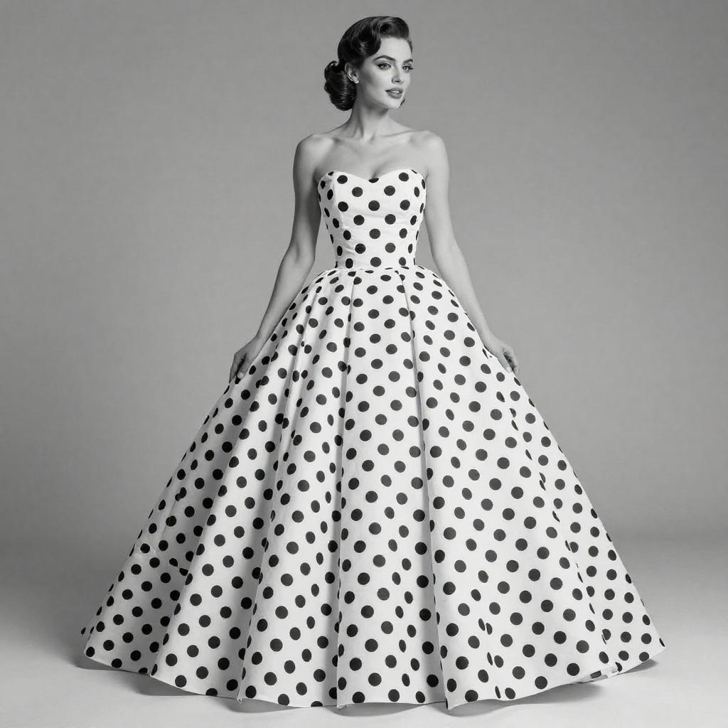 A poised woman models an elegant black and white polka dot ball gown with a fitted bodice and voluminous skirt, styled with a classic updo. The black-and-white photography highlights the vintage-inspired fashion and refined silhouette, evoking timeless glamour.
