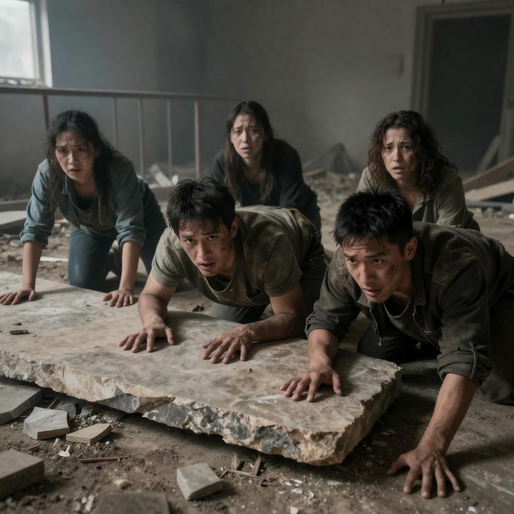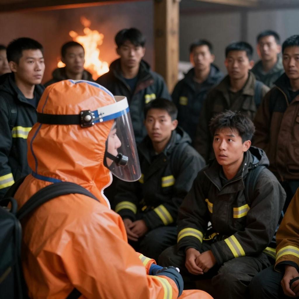 Photograph of a crowded indoor scene with a person in an orange hazmat suit with a clear face shield in the foreground. Others wear dark, rugged clothing; some have hooded garments. Background includes wooden structures and a fire. Group sits and stands, looking at the hazmat-wearing person. Intense expressions on faces. Multiple people.