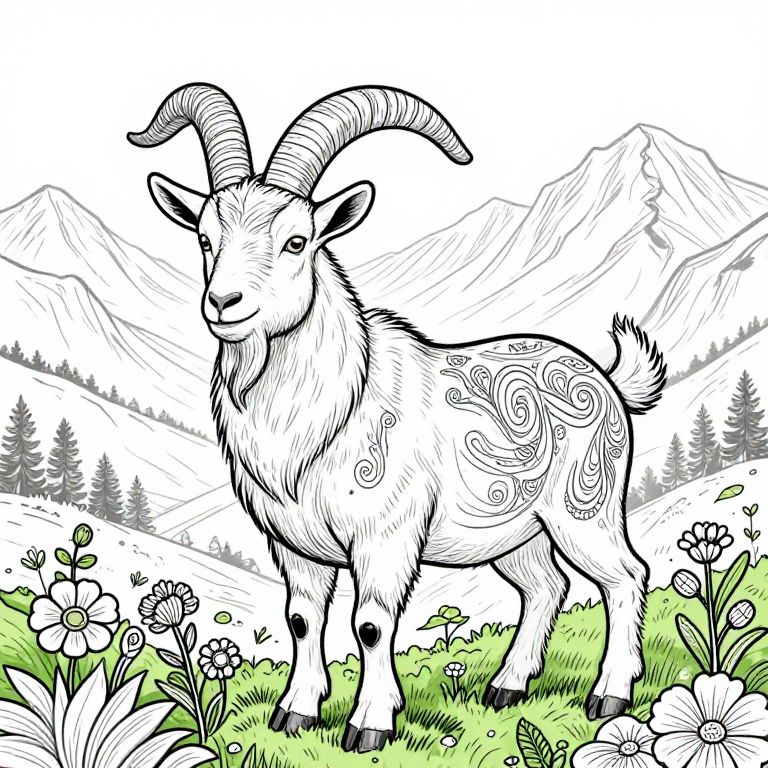 The image depicts a detailed coloring book line art of a goat with a prominent horn, set against a serene mountainous landscape. The goat, adorned with intricate patterns and textures, stands gracefully amidst a vibrant array of flowers and foliage. The background features majestic mountains, adding depth and a sense of grandeur to the scene. The goat's body is decorated with swirling, floral-like designs, enhancing its artistic appeal. The overall composition is harmonious, with the goat centrally positioned, surrounded by the lush greenery and the distant, majestic mountains, creating a balanced and visually engaging image.