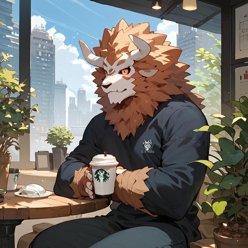 Digital illustration of a humanoid monster character with a lion-like mane and horns, sitting in a modern city café. The character is wearing a dark long-sleeve shirt and holding a Starbucks coffee cup, surrounded by potted plants and cityscape through large windows in the background. The scene is bright with natural sunlight.