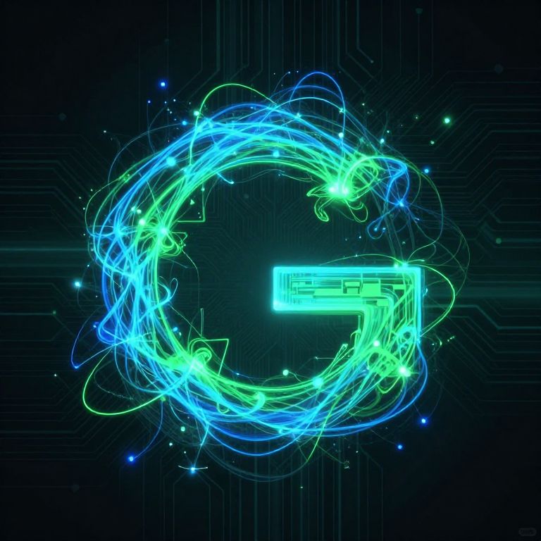 Abstract art portraying Google stable diffusion technology with intertwining streams of electric blue and green light, forming a complex pattern on a dark backdrop with subtle circuit textures