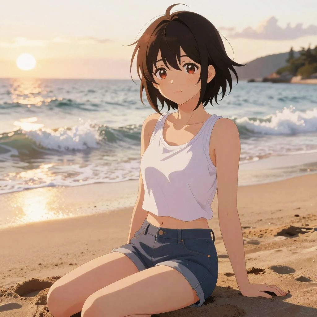 14 year old anime girl with playful smile, wearing headphones and a hoodie, sitting on a rooftop under starry night sky, digital anime art with neon highlights and soft shadows