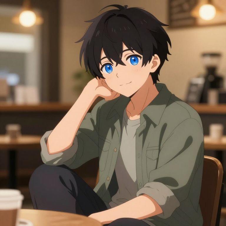 Anime-style digital illustration of a young man with black hair and bright blue eyes, sitting in a cozy café, wearing a green shirt and grey tee,
