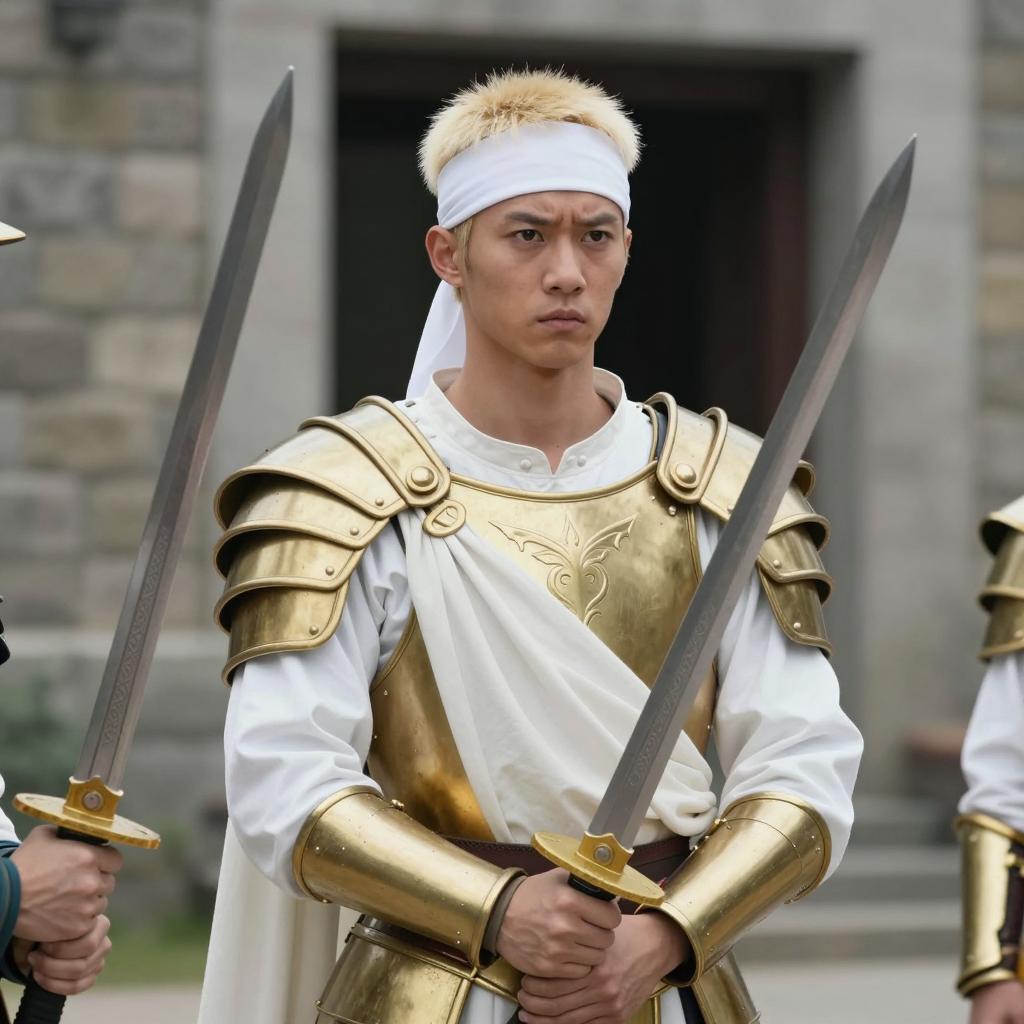 Group of eight people in a crowded, dimly lit room. Central figure, shirtless with blue swim trunks, surrounded by others. One person in colorful outfit with camera on left, others in bikinis. Bright yellow spiky headpiece worn by person in blue bikini. People touching, interacting closely. Background includes orange clothing and blurred figures. Facial expressions range from surprised to focused.