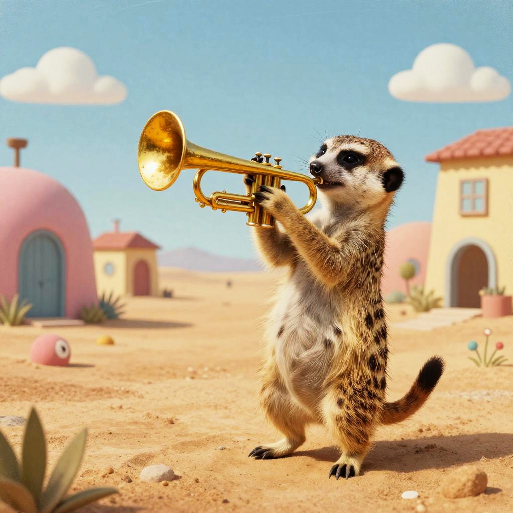 Lowbrow art of a jazzy meerkat playing a trumpet, influenced by Takashi Murakami, with a whimsical desert town with pastel buildings, vibrant colors, grungy textures, playful and surreal elements