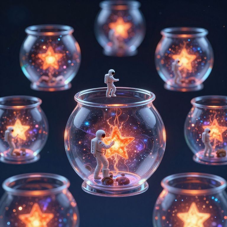 In a surreal, cyberpunk-inspired digital artwork, a sea of floating, translucent fish bowls contains miniature universes with boiling galaxies, each inhabited by tiny astronauts in minimalist suits tending to fiery orange stars amidst a cosmic backdrop of glowing particles and ethereal light effects.