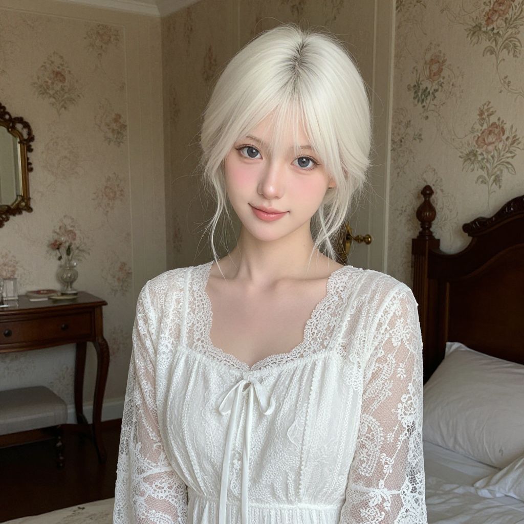 A beautiful Belgian lace lady with soft, porcelain skin and delicate features—high cheekbones, large expressive eyes, and a gentle smile—wears a vintage white lace dress in a quiet, sunlit antique bedroom with floral wallpaper and wooden furniture, exuding delicate white elegance