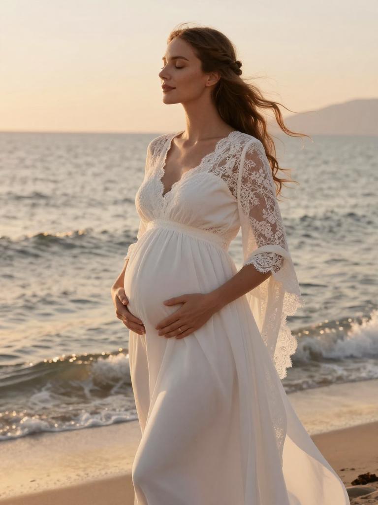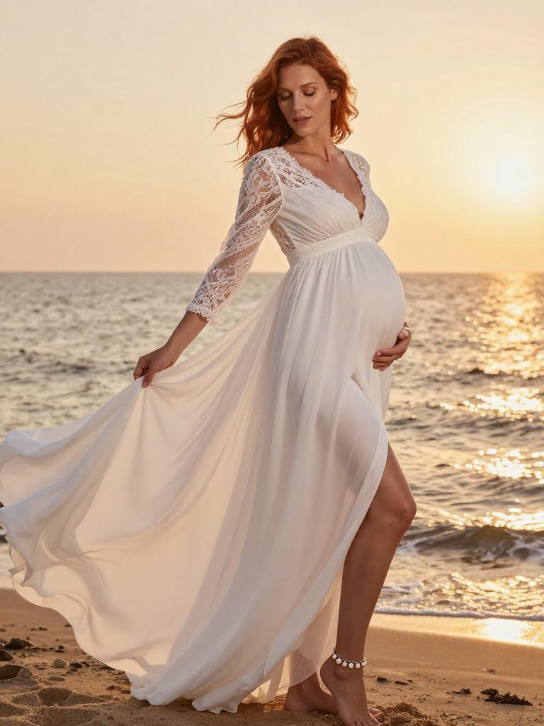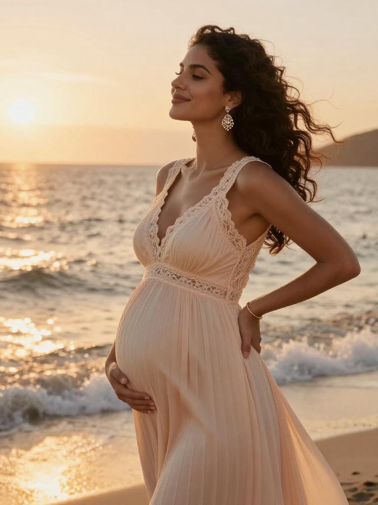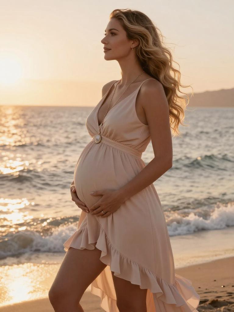 Pregnant fashion outfit, radiant expecting woman standing by the ocean during golden hour, wearing floral print chiffon maternity wrap dress with flutter sleeves with a long pendant necklace resting gently over her bump, soft blonde waves down her back hair gently moving in the breeze, posed holding the edge of her dress in one hand while the other gently cups her bump, looking down along the shoreline, soft warm sunlight illuminating her glowing skin and highlighting the fabric details, warm orange and yellow tones reflecting on the water, romantic and serene atmosphere, high-end maternity fashion photography, ultra-detailed