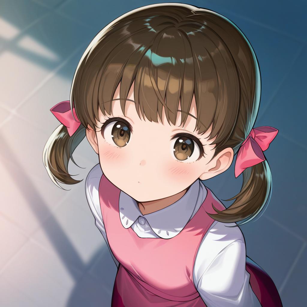 Digital illustration of an anime-style young girl with brown short twintails tied with pink ribbons. She has large brown eyes, a white collared shirt under a pink dress, and a subtle blush on her cheeks. The background features a softly lit tiled floor.