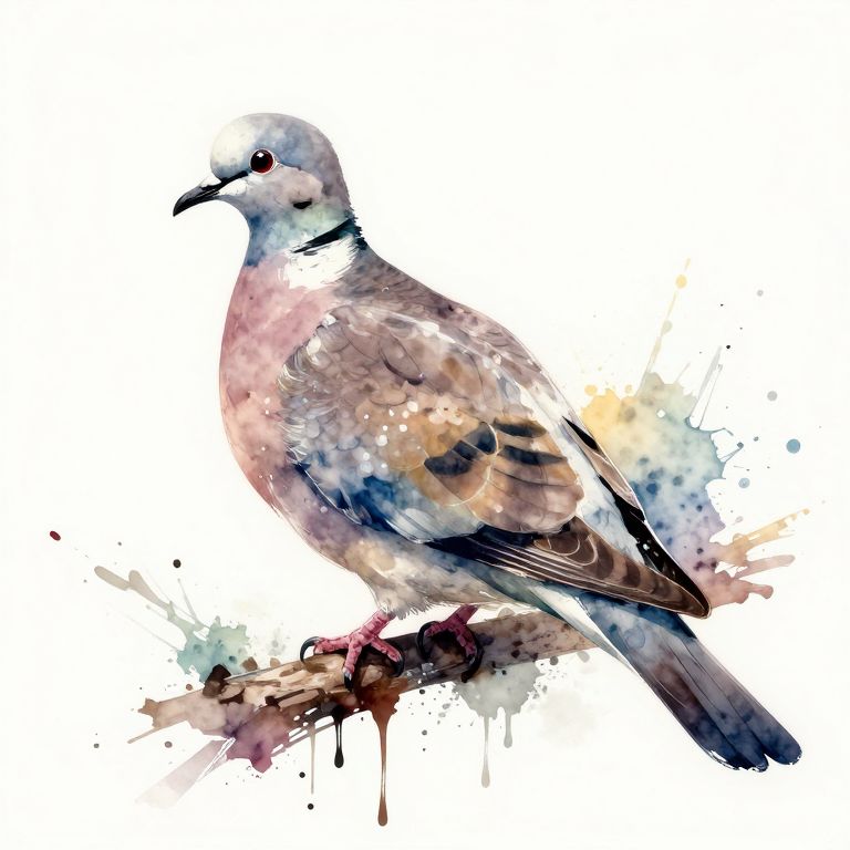 An abstract watercolor painting of a turtle dove perched on a branch, with paint splatters and dripping effects against a white background.