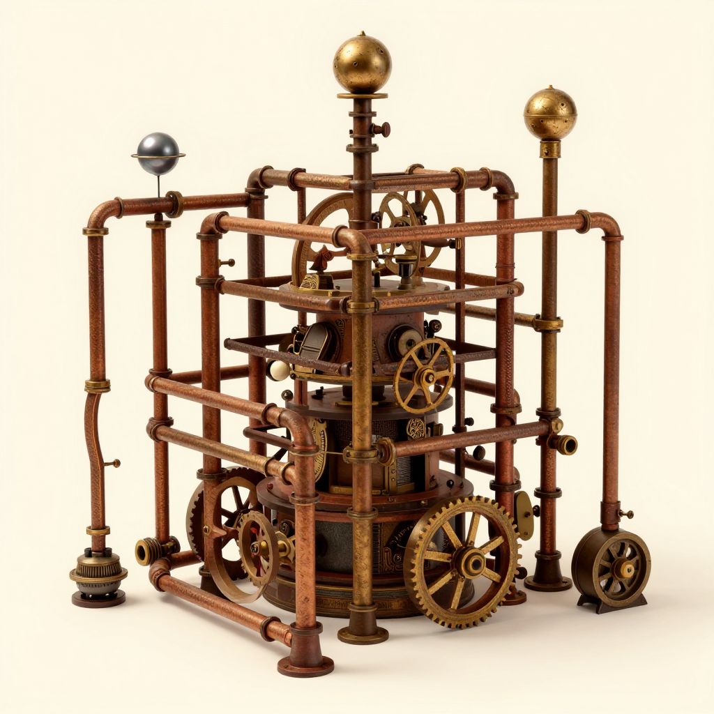 Detailed Rube Goldberg machine images capturing a maze of pipes, switches, wheels, and balls in synchronized motion, with a steampunk flair and warm, rich tones