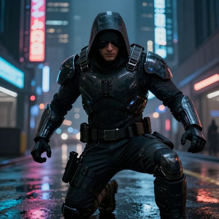 Photorealistic CGI of a hooded, armored vigilante kneeling on a rainy city street, neon lights glowing in the dark, futuristic urban background.