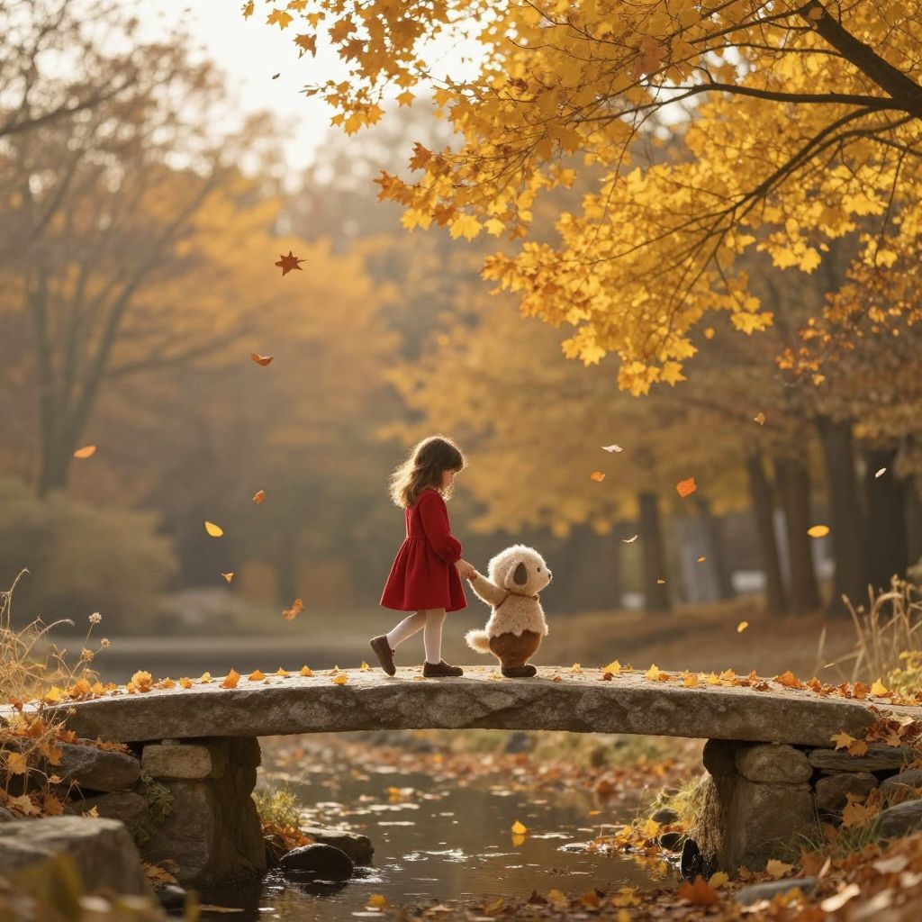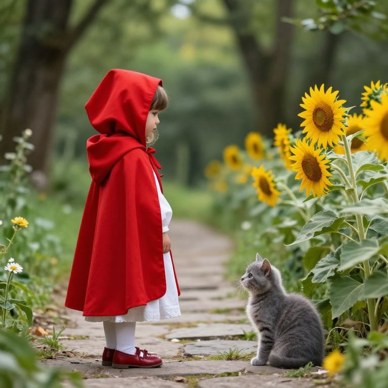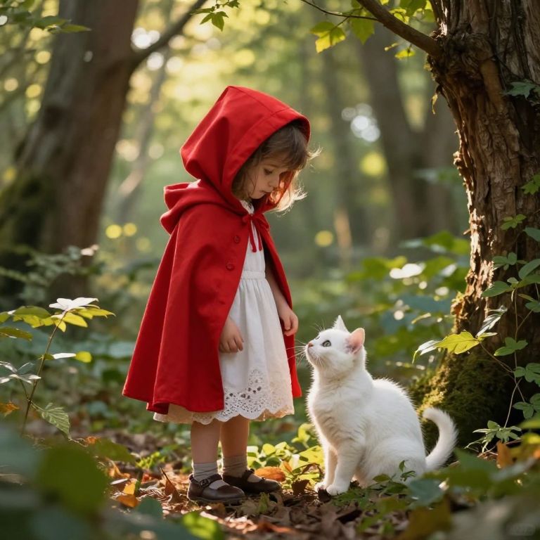In the dappled embrace of a sunlit forest, Little Red Riding Hood stands at the threshold of wonder and mystery, her gaze meeting the curious eyes of a small white cat, as the gentle rustle of leaves and the warmth of sunlight weave a tapestry of innocence and quiet companionship.