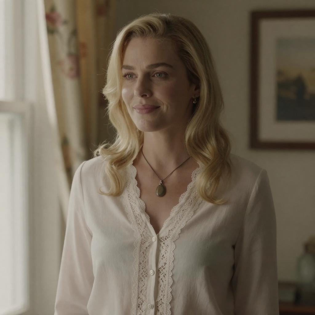 Photograph of a blonde woman with shoulder-length hair, light skin, and blue eyes. She wears a beige shirt, gazing slightly to the side with a subtle smile. Background is blurred greenery and water. Soft natural light. Close-up.