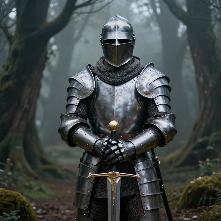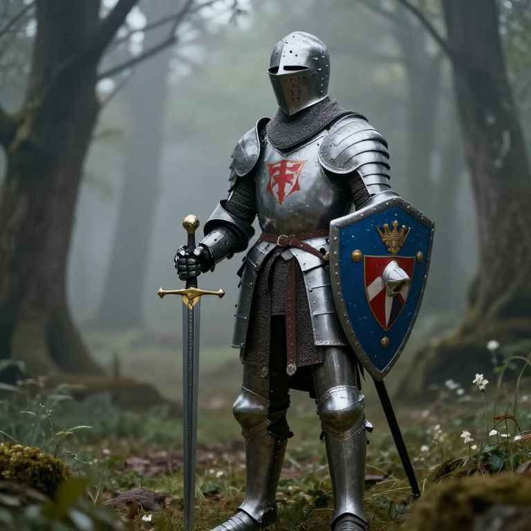 Portrait of a kight in elaborate battle armor, holding a glowing shield and sword, set in a lush enchanted forest with light rays filtering through ancient trees, highly detailed, dramatic fantasy illustration