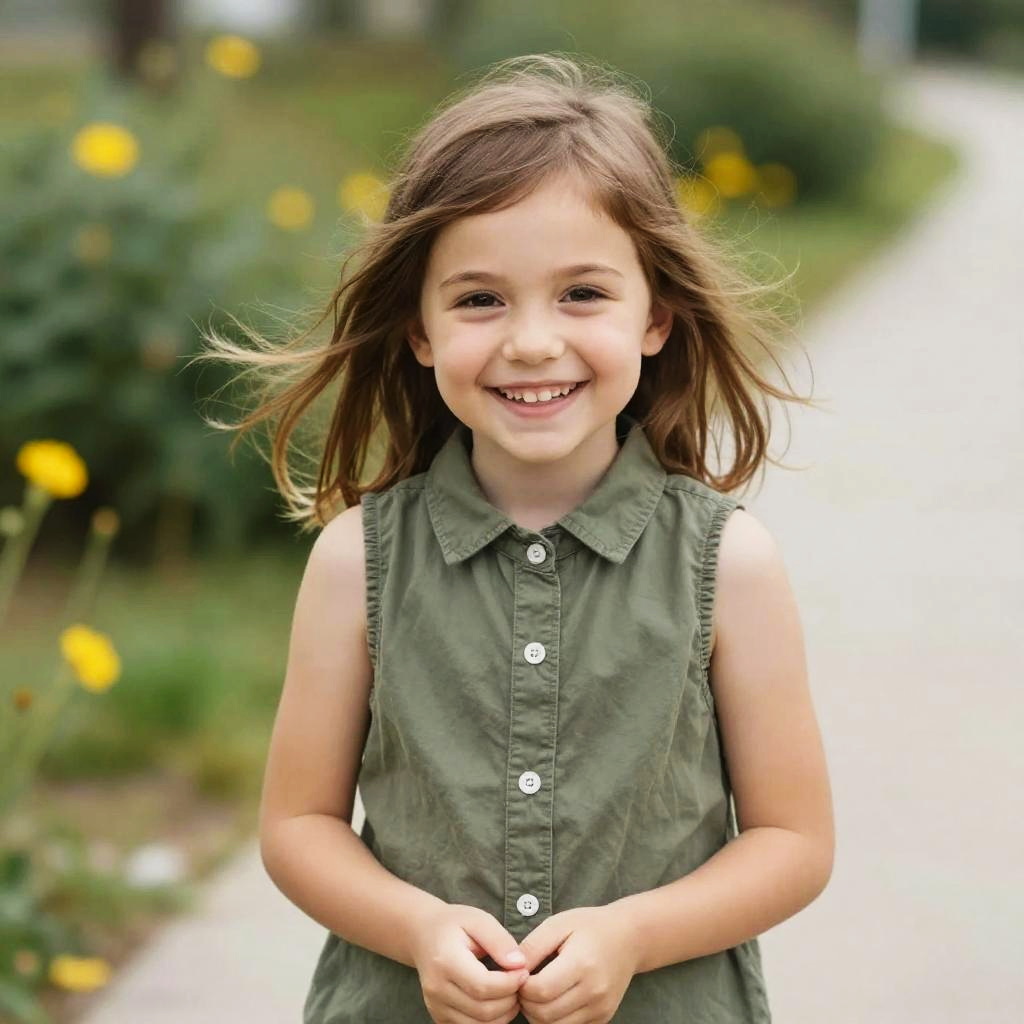 Photograph of a young girl with light brown hair, smiling broadly. She's wearing a sleeveless, olive green button-up shirt, and her hands are clasped together in front of her. The background is softly blurred with green foliage and yellow flowers, and there's a white line on the right side, suggesting a sidewalk. Her hair is windswept, adding a playful vibe.