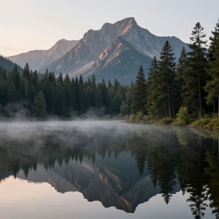 Youtubeclip of a serene mountain lake at dawn, mist rising over calm water, detailed reflections of pine trees and rugged peaks, photorealistic, peaceful and immersive atmosphere