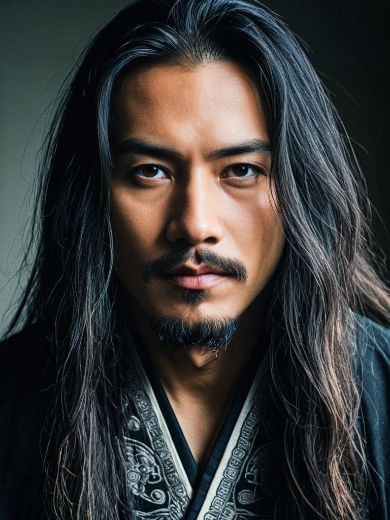 Man in Asian Long Hair costume, photorealistic close-up headshot