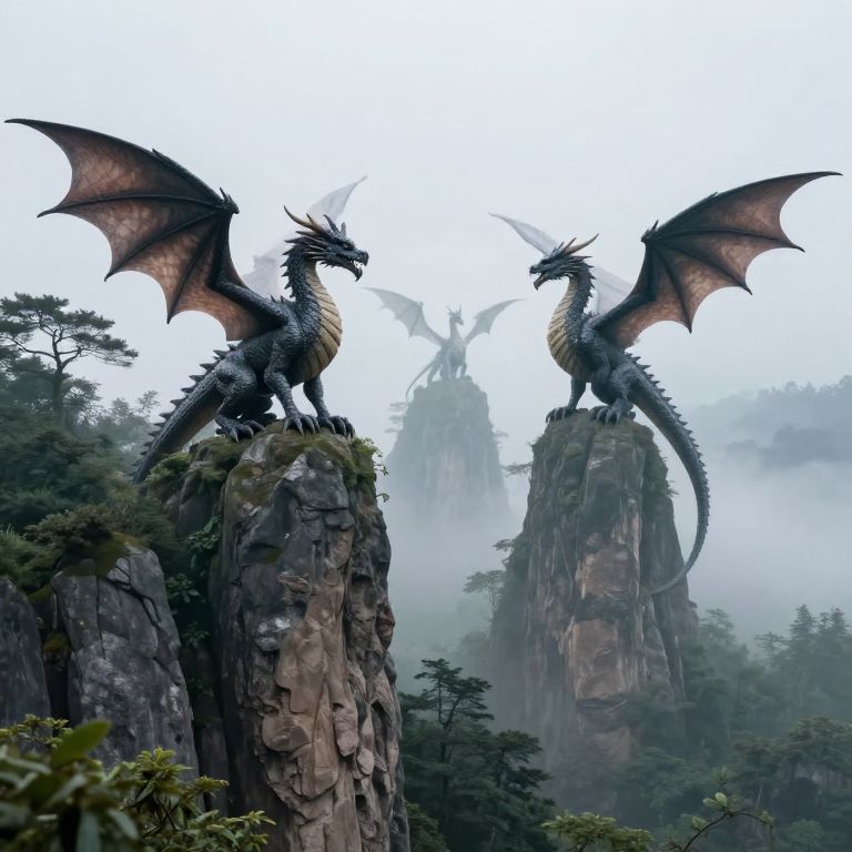 A trio of majestic, winged dragons perches serenely atop towering rock formations, their ethereal presence defying gravity as they survey a misty, forested landscape below.