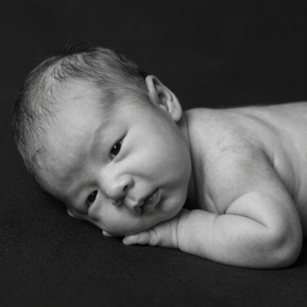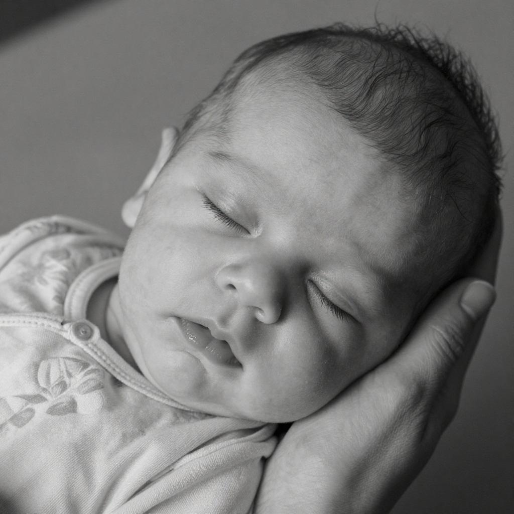 Black-and-white photograph of a sleeping newborn baby, nude, cradled in a man's hand. The baby is curled up, resting on the man's palm, with eyes closed and tiny fingers splayed. The man's hand is slightly hairy, and his arm is visible but out of focus. The background is completely black and blurred, drawing attention to the baby. The lighting is soft, highlighting the baby's delicate features and the texture of the man's skin. The camera angle is side-on, with a shallow depth of field.