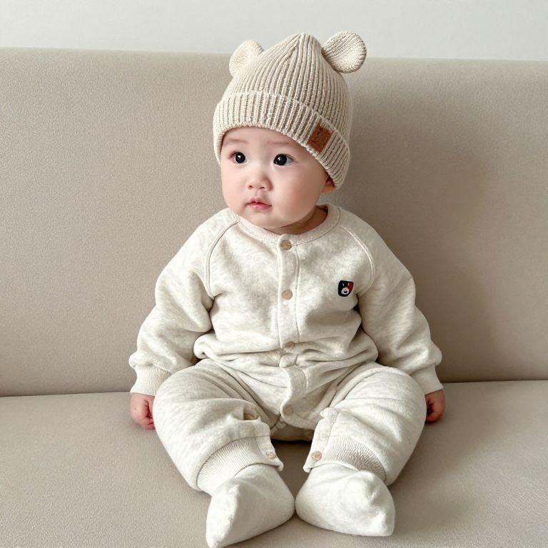 Neutral Baby Clothes, baby sitting on a couch wearing a knitted hat